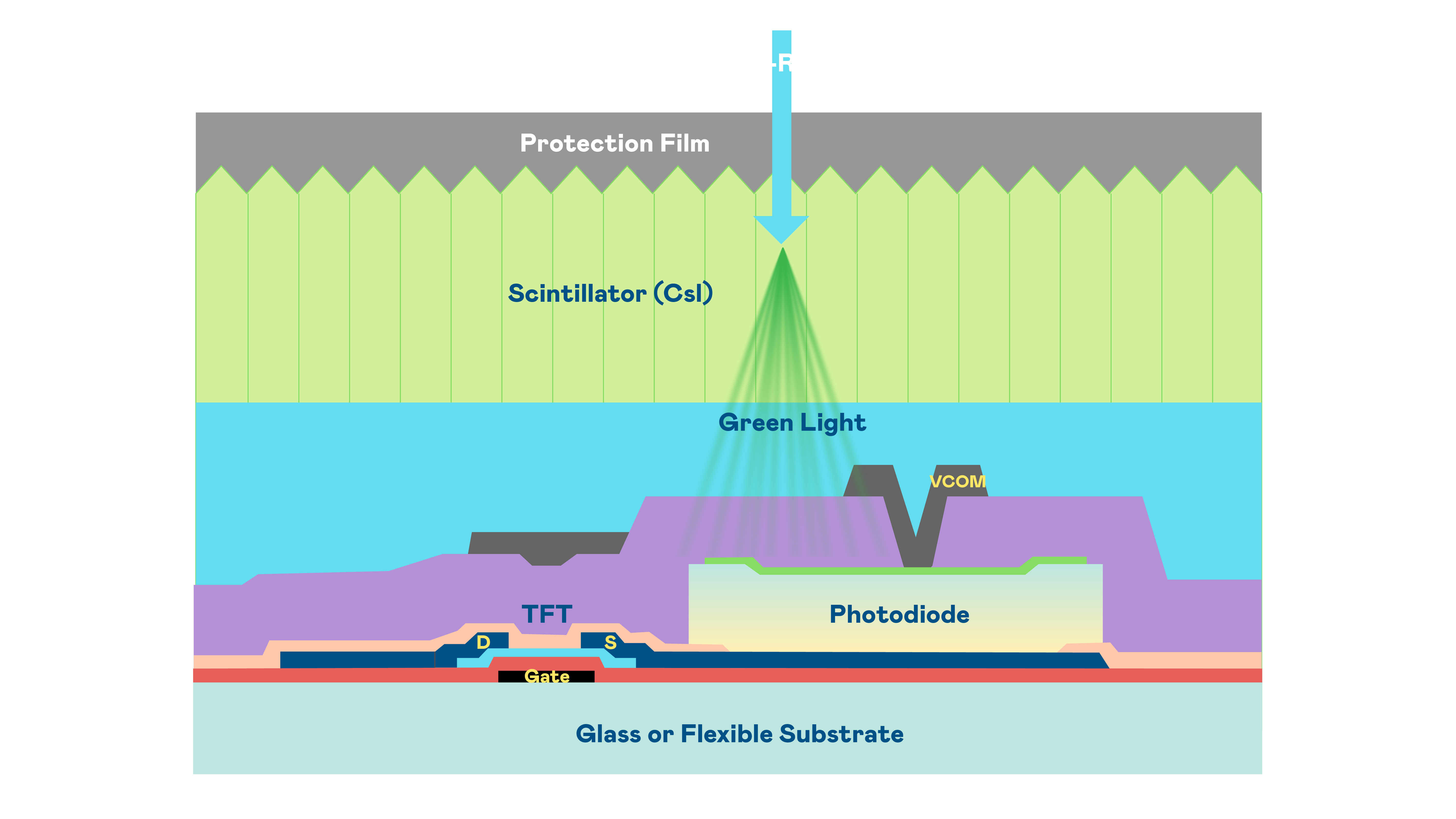 VR彩票的X光影像感测阵列使用薄膜电晶体 (TFT) 作为每个像素的读取开关,搭配光电二极体(Photodiode)的光电转换元件,用以感测X光影像讯号。